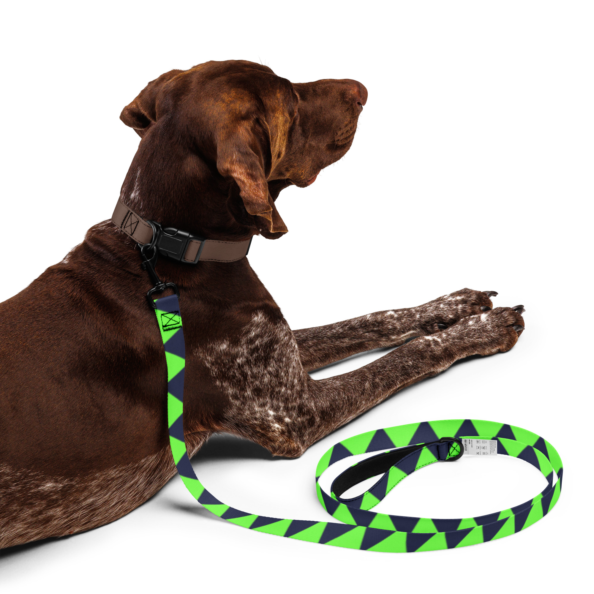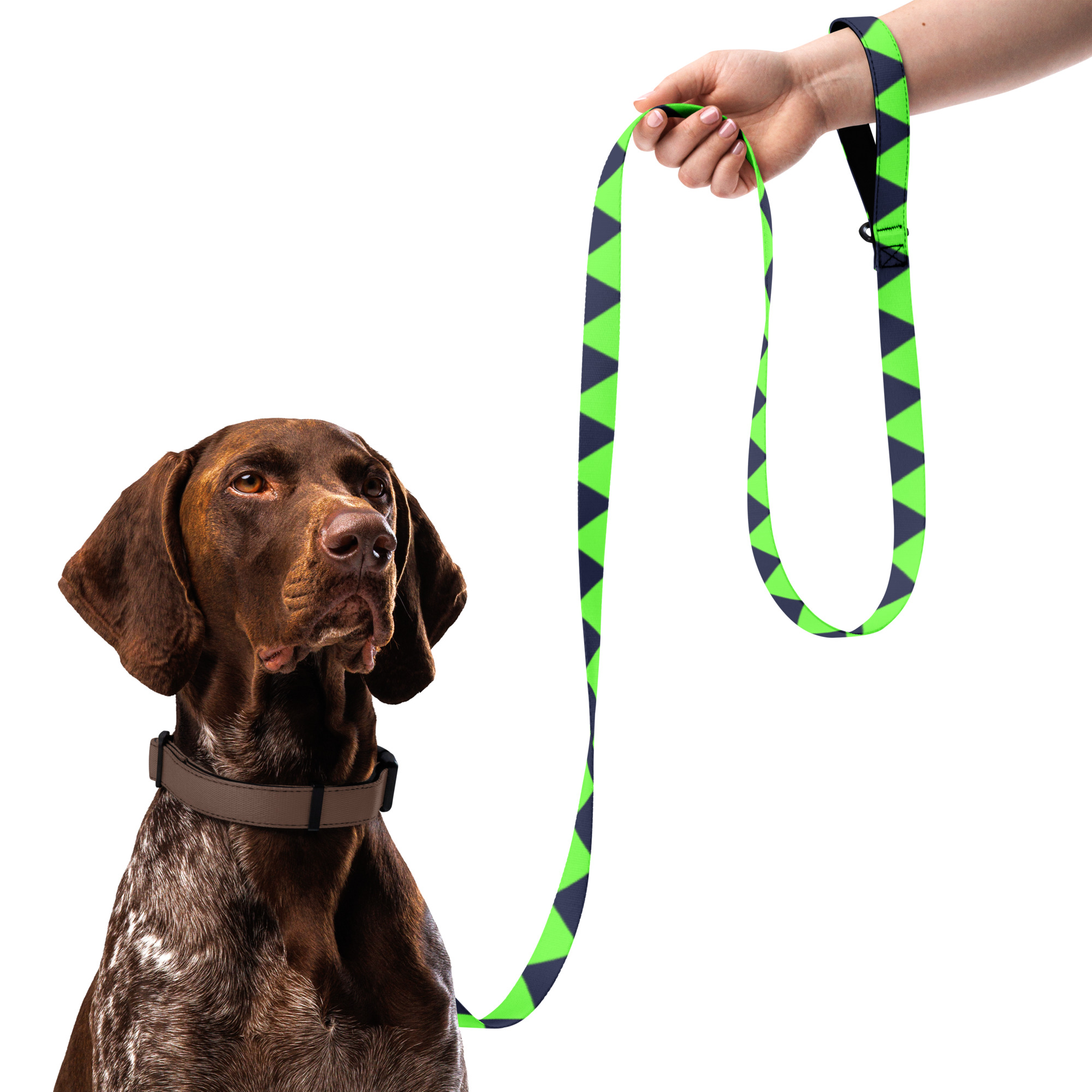 Doprajte svojmu miláčikovi štýl a pohodlie s týmto vodítkom – Štýlové vodítko pre psov – trojuholníkový vzor čiernej a zelenej